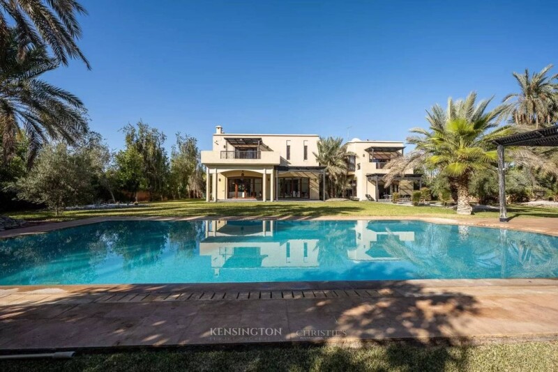 Ideally located near the Palmeraie Golf Course, this villa for sale offers 680 m² of living space, set on a 2,100 m² plot. The ground floor, covering 360 m², consists of several spacious lounges and living areas. The cedar wood ceilings add a refined Moroccan touch to each room. An elegant Moroccan-style lounge and a fully equipped modern kitchen complete this level of the villa. Upstairs, you'll find a 120 m² master suite, along with three additional suites, each featuring a dressing area and private bathroom, totaling an additional 320 m² of space. Expansive terraces provide breathtaking views of the meticulously maintained garden. Outside, a private swimming pool invites relaxation, while a caretaker’s accommodation and a service area adjacent to the kitchen offer both practicality and comfort. Please feel free to contact us for more information.