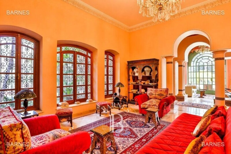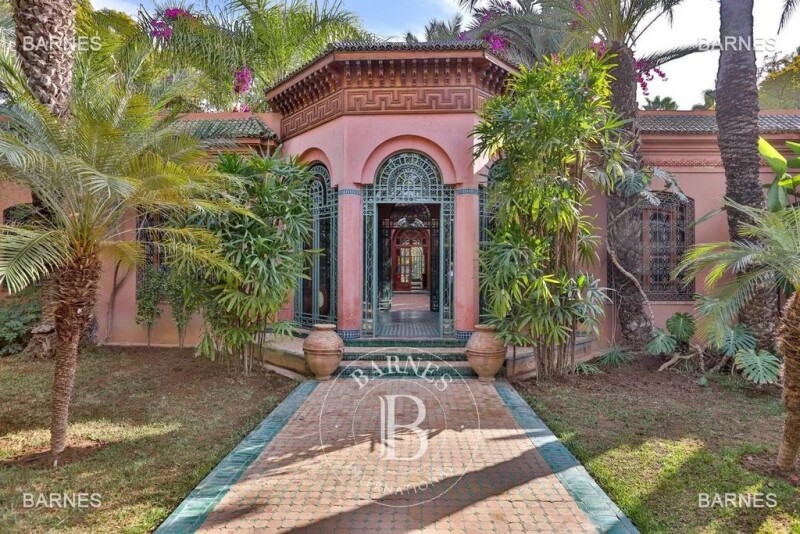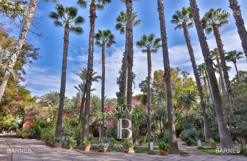 Arab- Berber superb Palace , located on a one hectare oasis . Beautiful entrance which serves many different reception rooms and a dining room , large kitchen with pantry ; 4 large suites with walk-in bathroom and a large master suite upstairs . Beautiful heated pool with Jacuzzi area and sports area , sauna, hamam . 3 car garage housing Staff Finish and quality materials. Gas central heating and air conditioning sheathed .