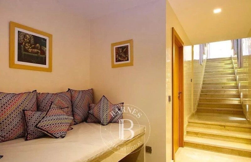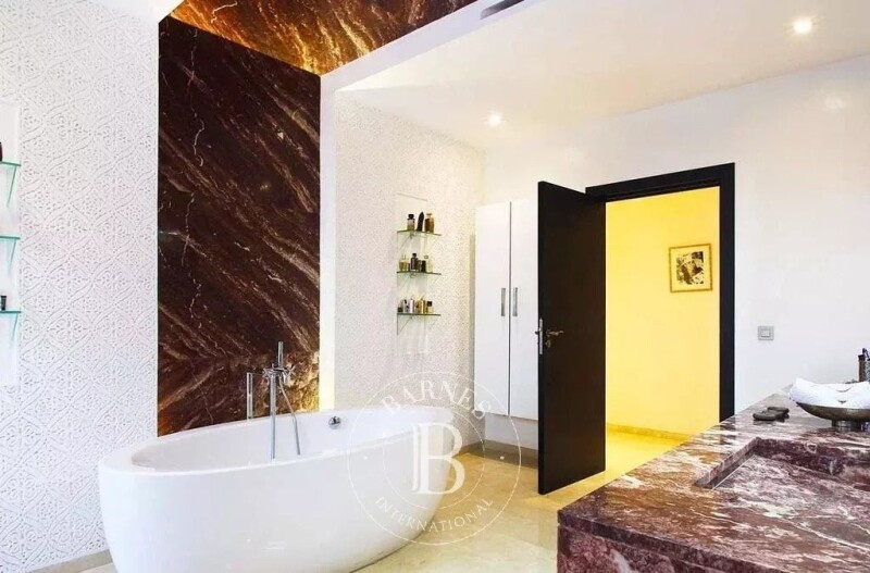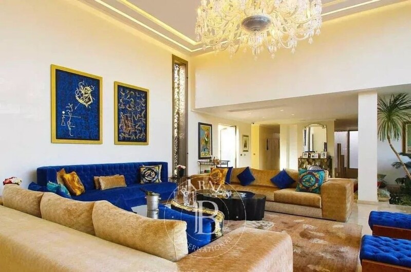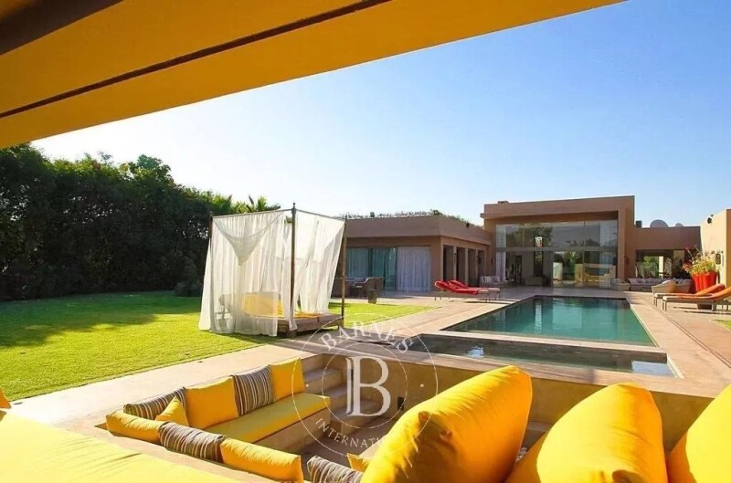 Beautiful modern-style property with Moroccan touches. Located very close to Marrakech, on a beautifully landscaped park. The tastefully furnished villa is sold fully furnished and features 5 suites, several living spaces with high ceilings, a very large pool, and staff accommodation. You will find all modern comforts here.