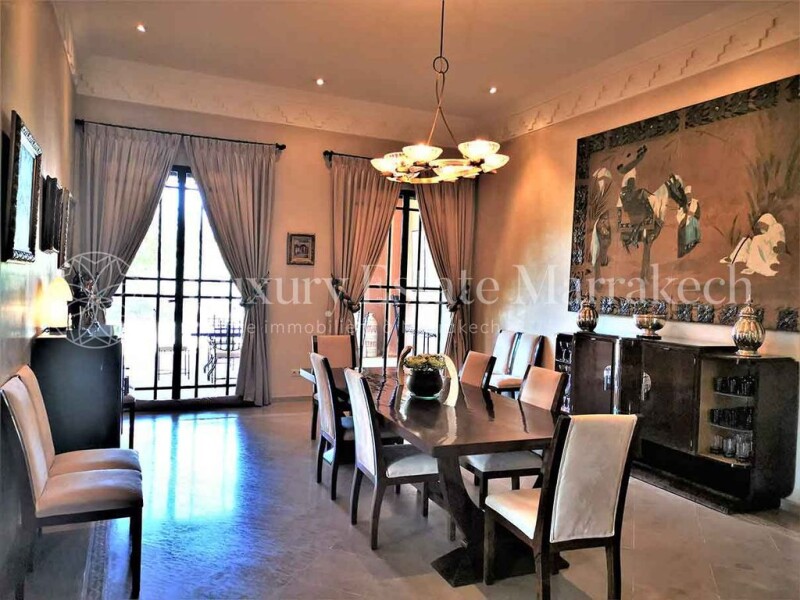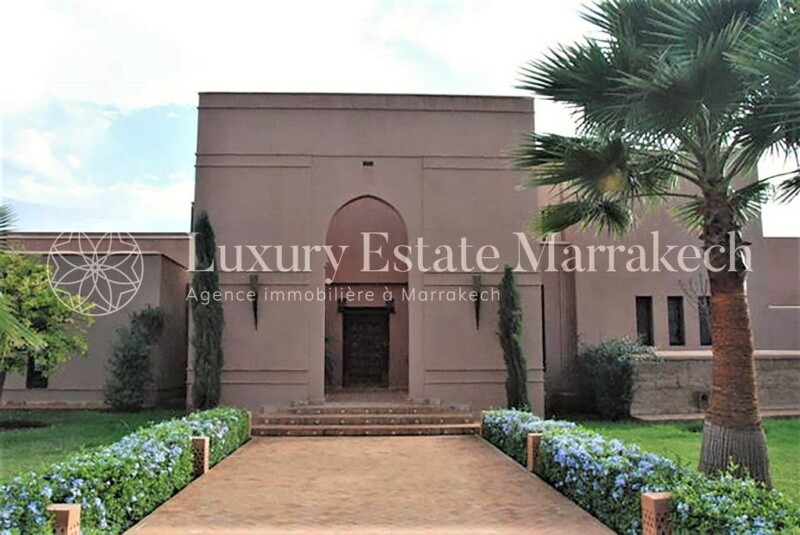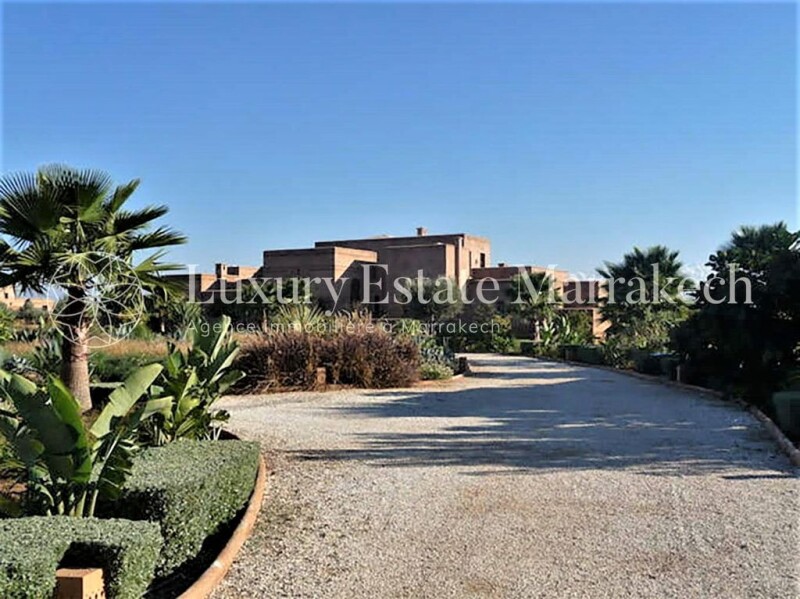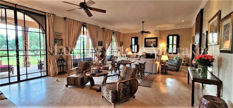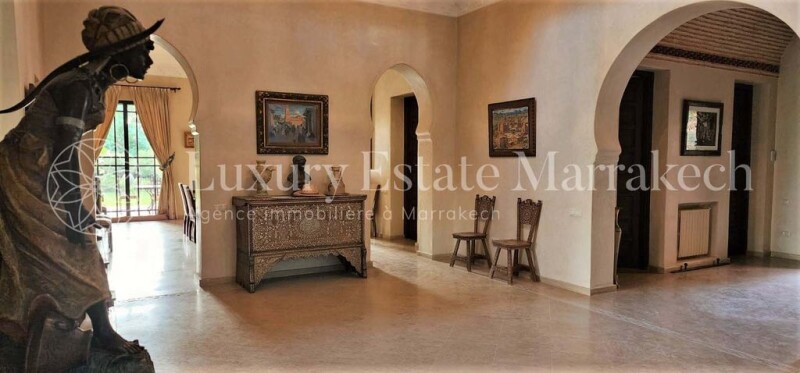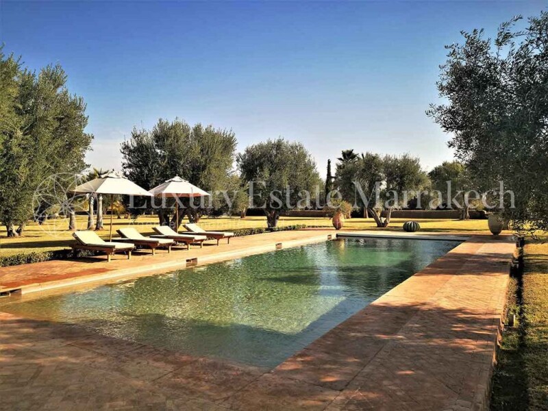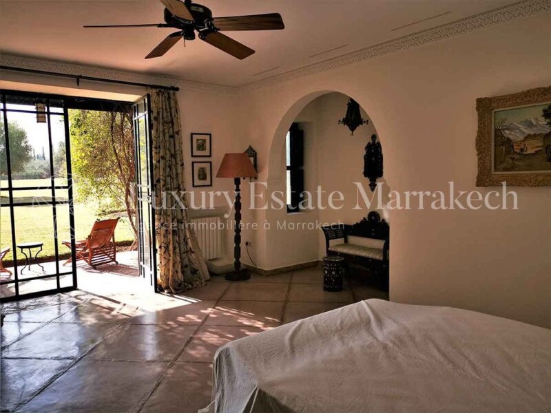 Exceptional property, composed of 850m2 of living space on a plot of 3.36 hectares, beautifully wooded with a 180° panoramic view of the Atlas chain and located 15km from Marrakech by the Ourika road. Most of the paintings, sculptures, objects and fabrics, decorative and architectural elements are old and original pieces, have been found during the travels of its owners. The architecture is the work of renowned architect Karim El Achak. The gardens were designed by the brilliant Moroccan landscape architect, Camélia Bouazzaoui, who notably designed the “Pacha” gardens, those of the Raffles hotel in Marrakech and the “Sheraton” hotel in Casablanca. Main house: Ground floor: – Open-air courtyard – Vaulted entrance in Bejmat with cloakroom and guest toilet – Atrium with mezzanine under an 8-meter-high dome To the right of the atrium – Living room with a large fireplace and three French windows overlooking the garden and the Atlas – Veranda living room with 12 brick columns – Dining room with fireplace and two French windows – Covered summer dining room opening onto the garden – Office with stairs down to the basement – Large fully fitted kitchen – Kitchen courtyard with 2 staff bedrooms with shower room, toilet and external staircase leading up to the terrace To the left of the atrium: – Internal staircase leading up to the bedrooms on the 1st floor and the terrace – Large patio rectangular interior with marble fountain – Closed and heated gallery surrounding the interior patio with 4 French windows – Bhou (small Moroccan-style living room) opening onto the gallery Bedroom 1: – Entrance and large dressing room – Bedroom with fireplace and French window opening onto the garden with a view of the Atlas – Bathroom with round shower bath in tadelakt, 2 basins and closed toilets Bedroom 2: – Entrance and large dressing room – bedroom with fireplace and French window opening onto the garden with view of the Atlas – Bathroom with bath, separate shower, 2 basins and closed toilets Bedroom 3: – Entrance and two large dressing rooms – Large bedroom with fireplace and French window overlooking the garden and view of the Atlas – Menzeh en moucharabieh opening onto the garden – Office room with fireplace and French window overlooking the garden and the Atlas – Octagonal living room with fireplace, overhung by an 8-meter brick dome – Billiard room with fireplace shared with the octagonal living room Floor: – Small living room on the mezzanine with Menzeh in moucharabieh overlooking the interior patio – Summer living room with fireplace opening via 3 arches onto a large terrace facing the Atlas – Behind the summer living room, small kitchen e, storage room and closed toilet. Bedroom 4: – Entrance and large dressing room – Bedroom with Menzeh in moucharabieh overlooking the garden and the Atlas – Bathroom with bath, separate shower, 2 basins and closed toilets Bedroom 5: – Entrance and dressing room – Bedroom with door access to a terrace overlooking the garden and the Atlas – Bathroom with bath, separate shower, 1 basin and closed toilets Basement: – English courtyard with technical room for the boiler – Hammam with shower and toilets – Lingerie – Bedroom cold – Large reserve Swimming pool: – Large swimming pool of 16.6m x 6m, equipped with an electric opening and two heat pumps – Pool House including a covered dining room, a changing room with shower, 1 basin, closed toilets and a equipped kitchen – Summer living room under a veranda – Cellar with access ramp to the technical room of the swimming pool and a large storage room Garden: – Arrival by a circular path lined with varieties of flowers and tropical plants and Washingtonia palm trees, with a vast central land planted with varieties of grasses and agaves – Large lawn of 7000m2 planted with century-old olive trees and Washingtonia palms – Plantations of sour orange and citrus fruits, rose beds, olive grove of one hectare (450 trees), jacarandas, 2 vegetable gardens Equipment: – 1 drilled well 120 meters deep, 23m3 water tank and 2 boosters – Automatic watering of lawn, trees and plantations (1 hectare of olive trees and others) – Underfloor heating for the reception rooms and radiators in all the other rooms, all powered by a gas boiler – Hot water produced by the gas boiler or electricity from solar panels – Split duct and wall systems in all the bedrooms, the octagonal living room, billiards and Bhou. – “Hunter” fan in all bedrooms, octagonal living room, billiard and Bhou. – Connection to the fiber optic network – Anti-intrusion system with exterior radar and motion detectors – Remote controlled opening of the gate and the garage shutter. – Electric shutters on the doors of the living room and dining room. – Closed garage for two vehicles. – Covered shelter for 8 vehicles. Service accommodation: – 1 bedroom and a living room with kitchen area, a bathroom with shower, washbasin and toilet – 2 independent bedrooms with shower, washbasin and toilet Caretaker’s house – 1 bedroom with kitchenette and a bathroom water with basin, shower and toilet.