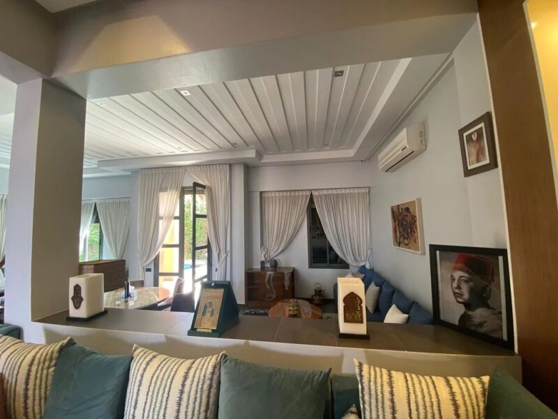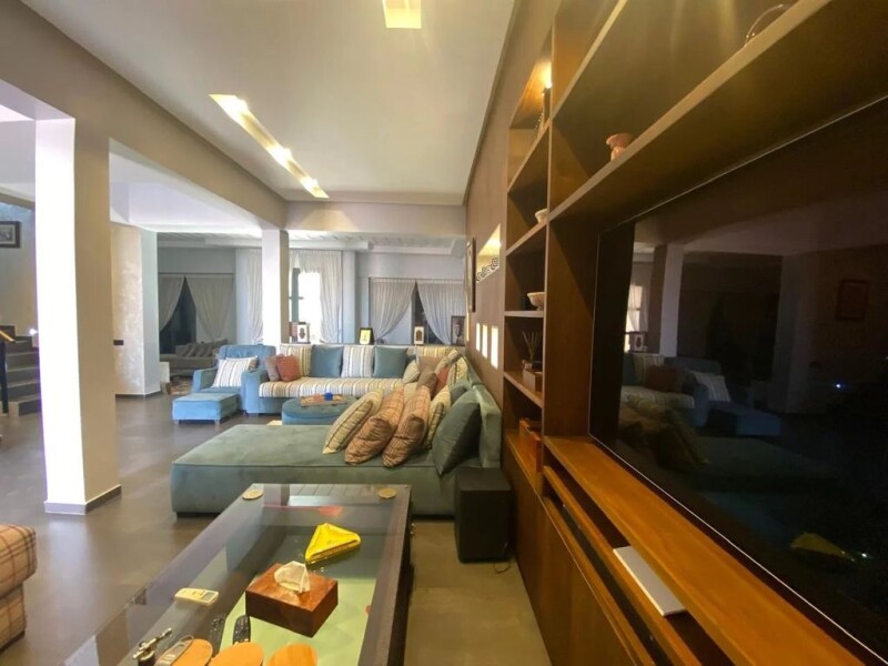 Villa in Targa, Riad Jawhar2, in a position with open views, 400m2 of land, 450m2 of living space with swimming pool, Existence of an operational well equipped with an anti-limescale filter for the entire house, Covered garage for 2 cars with electric door Remote monitoring system, Solar LED projector around the house Interior and exterior painting. Redone in 2024. DRC 4 open lounges overlooking the swimming pool, A bedroom serving as an office, Guest Toilet, Basement, Large equipped kitchen overlooking English courtyard, 1 bedroom for staff, Bathroom plus shower for staff 1st floor Master suite with dressing room and bathroom Two bedrooms with bathroom and closet, Two storage rooms on the roof accessible via the continuity of the stairs.