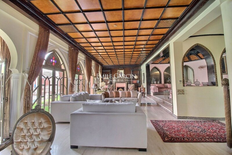 Located on a golf development just a few minutes from the centre of Marrakech, this house presents 650 sq.m of living area exuding an oriental style. Sitting on a private plot of 990 sq.m, it comprises a large reception, lounges with fireplaces, a dining room and five ensuite bedrooms. Spacious interior. Excellent potential. Décor in need of updating. Swimming pool and hammam.