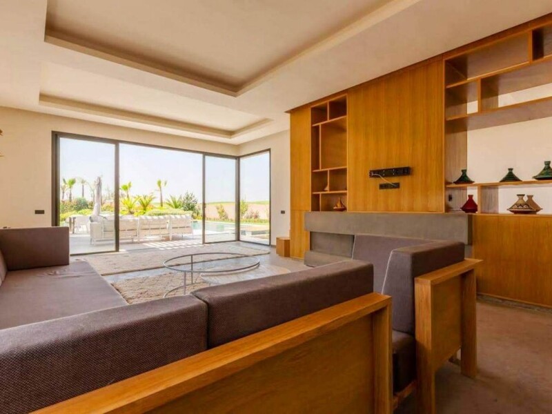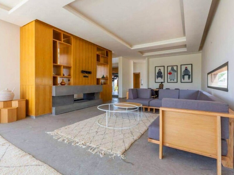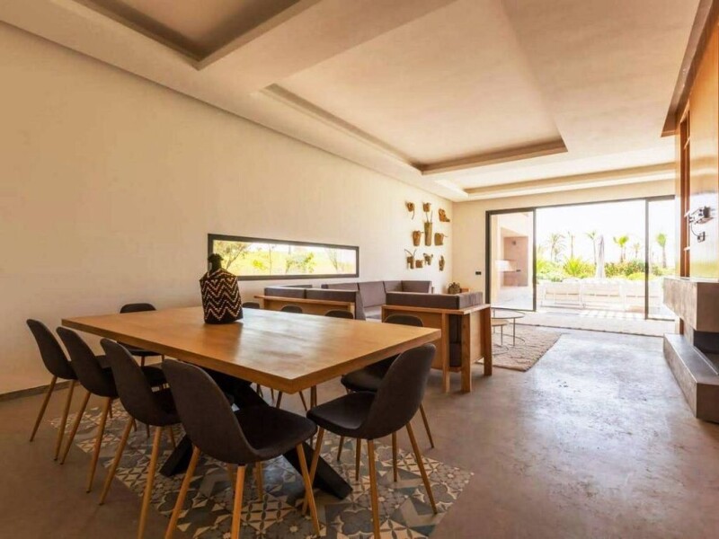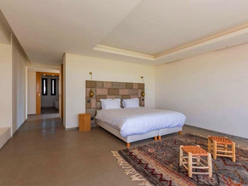 Charming new villa, Amelkis golf course, on 1500 m2, 500 m2 built, 4 bedrooms, swimming pool, Atlas view. 27-hole golf course, 10 minutes from Marrakech city center, fully enclosed and guarded, this pretty new villa, built on a plot of 1500 m2 offers on 500 m2, entrance, living room with fireplace, dining room, fitted kitchen, guest toilet, bedrooms with bathroom. Upstairs, 3 bedrooms all with bathroom, lounge area, south-facing terrace with magnificent views of the golf course and the Atlas. South-facing swimming pool. Very good quality construction, contemporary design, tel sat, wifi, reversible ducted air conditioning with programmable control per room.