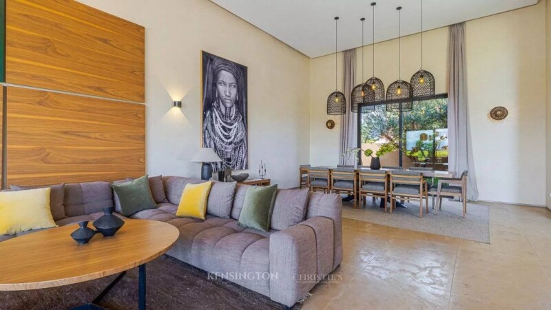 Christie’s Real Estate Morocco presents this stunning contemporary villa, brand new and fully furnished, located on the front line of the prestigious Amelkis golf course. Built on a 940 m² plot, including 400 m² of exclusive use, it offers a luxurious and private living environment. With a living area of over 450 m², the villa features a spacious, light-filled living room with a fireplace and dining area, opening onto a heated Bali stone pool. The modern, fully equipped kitchen with a central island combines elegance and functionality while remaining discreetly separated from the living space. Large glass doors seamlessly connect the interiors to the outdoor spaces, flooding the home with natural light. Three refined suites, each with its own private bathroom, open onto a secluded garden, ensuring peace and privacy. The basement includes an independent bedroom with an en-suite bathroom, ideal for hosting guests discreetly. On the upper floor, the master suite boasts a vast private terrace with panoramic views of the Atlas Mountains, creating a true haven of tranquility. Built with high-end materials and exquisite finishes, this villa perfectly balances comfort and modernity. It is fully air-conditioned and equipped with 26 solar panels for optimal energy efficiency. Additional features: Heated pool, front-line golf views, lush surroundings. Located just minutes from Marrakech, Amelkis Resort is an exclusive residential complex built around a renowned golf course, offering a peaceful and secure setting. Feel free to contact us for more information.