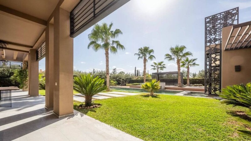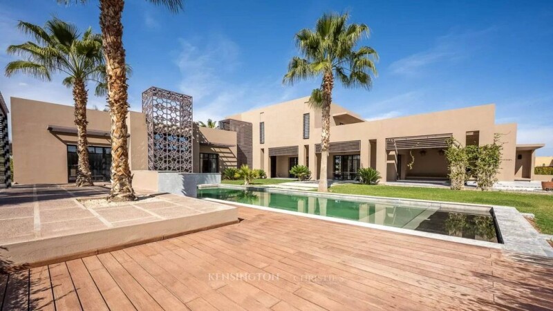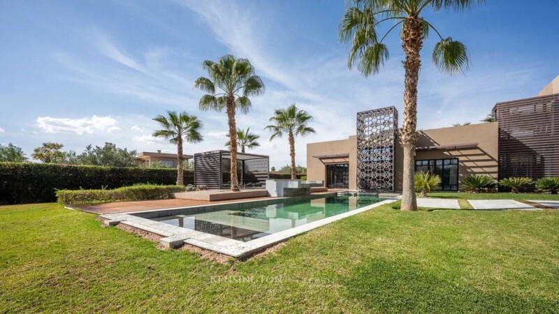 Kensington Luxury Properties is pleased to present this magnificent contemporary villa located in the heart of one of the most prestigious golf estates in Marrakech, just 7 minutes from the city center. Built on a 1,840 m² plot, this 800 m² villa is nestled in a mature, landscaped garden, offering a peaceful and exclusive living environment. With its high-end amenities, this property embodies luxury, comfort, and modernity in a unique setting. The interior of the villa features a master bedroom with an en-suite bathroom, spacious dressing area, ethanol fireplace, and two large private terraces. Three guest bedrooms, each with its own bathroom, complete the sleeping quarters. The spacious, bright living room, adorned with a fireplace, is perfect for relaxing or entertaining guests. The dining room and fully equipped kitchen complete this refined living space. The villa also offers a wine cellar for wine enthusiasts, as well as service areas including a laundry room and storage/utility room. Two service bedrooms and a garage are also available. Outside, you will enjoy a magnificent pool, a pool house, and pre-installations for an elevator and a hammam, allowing you to tailor the villa to your needs and fully enjoy the outdoor space. The villa offers breathtaking panoramic views of the garden and benefits from central heating to ensure optimal comfort throughout the year.