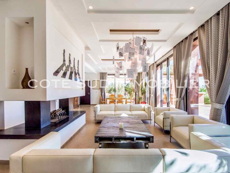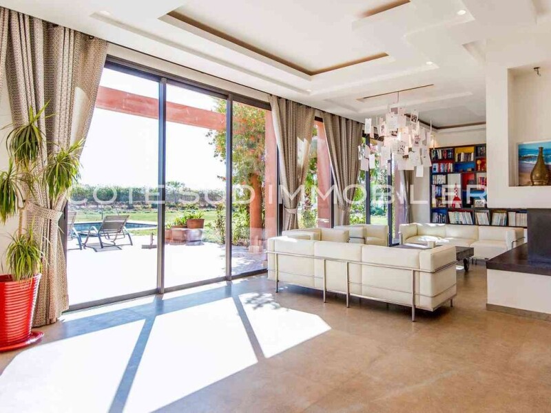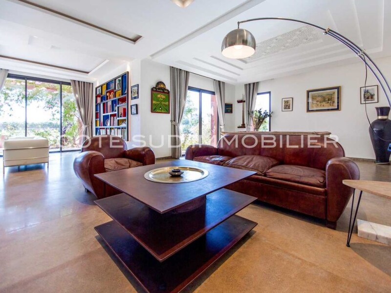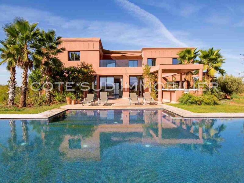 Very pretty modern villa, 3 bedrooms, 450 m2, guest pavilion 2 bedrooms, living room, 100 m2, swimming pool, on 1.7 Hect Facing the Atlas, 15 minutes from the center of Marrakech, this charming modern villa, new , offers on the ground floor: a large living room with fireplace, TV room, billiards table, a modern kitchen, a bar with cellar, a pantry, a bedroom bathroom, a guest toilet, a terrace with open kitchen and a storage room. upstairs, a mezzanine, 2 bedrooms, 2 bathrooms, dressing room, terrace. a guest pavilion with 2 bedrooms, 2 bathrooms, living room, fitted kitchen, terrace. Led lighting Landscaped park with trees, vegetable garden; Swimming pool 14 mx 6.5 m? 2 boreholes. Wifi, such as sat, last generation reversible air conditioning, economical and silent. Low charges, high rental value.