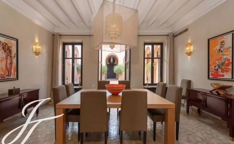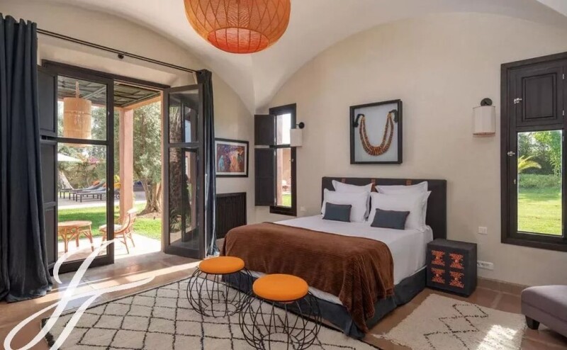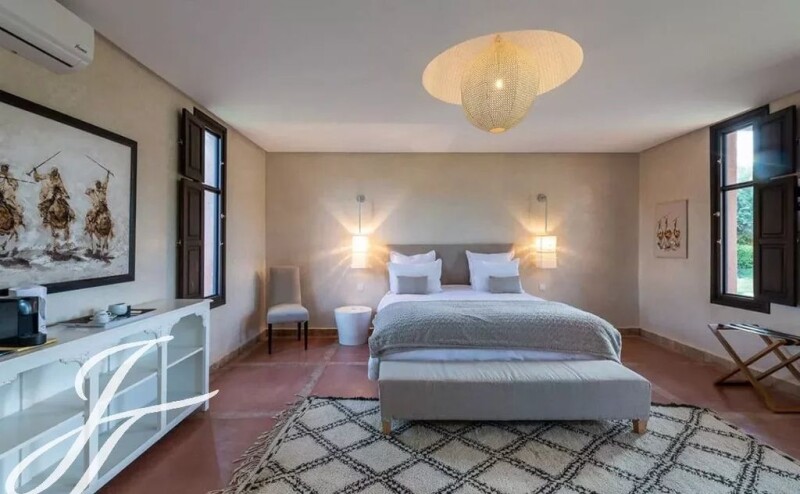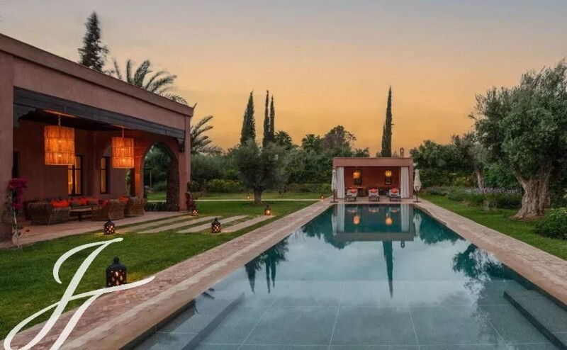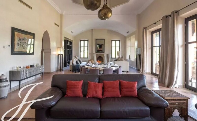 This property is enviably located in an exclusive gated community a mere 15 minutes from downtown Marrakech and a few minutes from major golf courses. Nestled in a mature 4 000 sqm park hosting a shaded parking, a heated swimming-pool with 2 pool-houses, the single-storey villa blends a traditional architecture, such as the entrance courtyard with fountain, and modern standards of comfort. Boasting a 500 sqm internal size, it features large reception areas with fireplace opening onto the terrace and the pool, a spacious fitted kitchen, a guest loo, 5 ensuite bedrooms as well as a spa with hammam and room for treatments. This titled property with central heating system is being sold partly furnished.