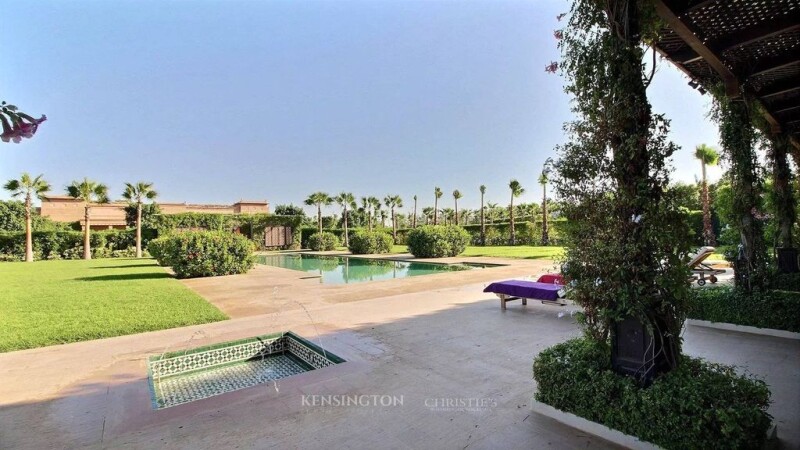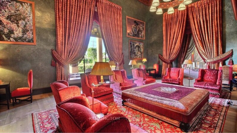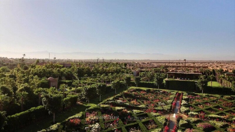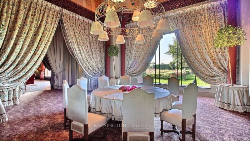 Located in the exclusive Palmeraie district of Marrakech, discover this splendid palace of 1800 sq.m on a plot of 2 hectares facing the Atlas Mountains. Largely inspired by the Alhambra Palace of Granada in Andalusia, this palace will seduce you with its proportions and volumes. Consisting of several large living rooms, beautiful library, modern and well equipped kitchen and back kitchen, 5 suites including 4 with two bathrooms each and all with their own dressing rooms. You will also discover in the basement of the palace a beautiful relaxation area consisting of a spa, Hammam, cozy lounges a bar and a disco. The garden will enchant you with its grandeur but especially the wonderful rose garden, further more there is a vegetable garden, large swimming pool with pool house, tennis court and various friendly pavilions where one can relax and eat in privacy and in different locations.