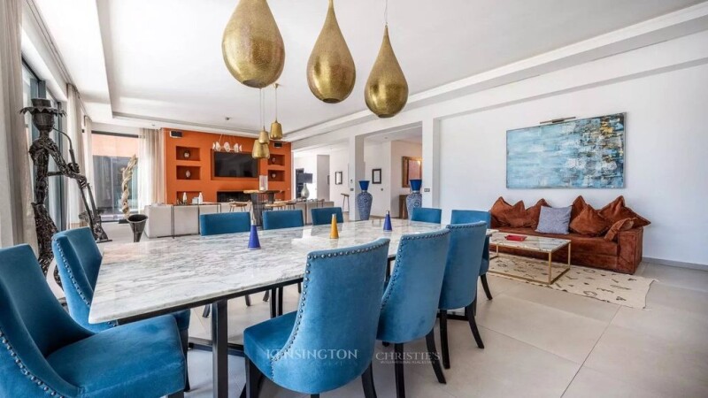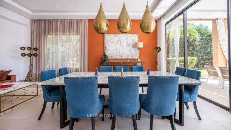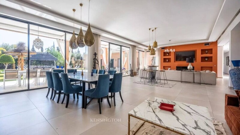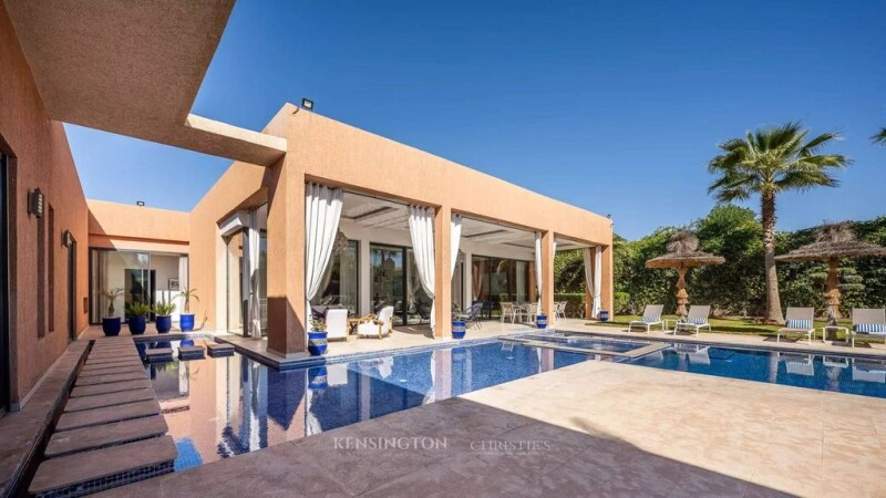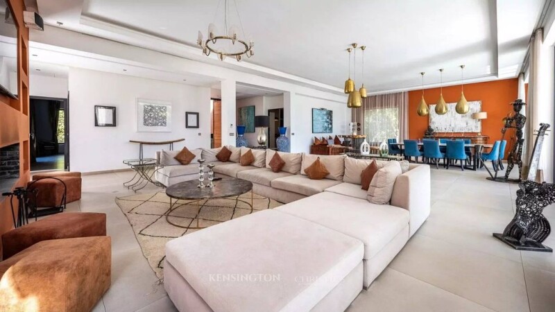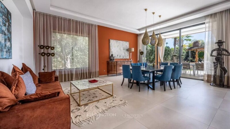 Kensington Luxury Properties presents this magnificent single-story villa, ideally located on the Route de l’Ourika, just 15 minutes from downtown Marrakech. Set on a vast 1,800 m² plot, this exceptional property offers 500 m² of living space, designed to combine elegance, comfort, and modernity. Upon entering, a bright double living room opens onto the garden through large bay windows, creating a spacious and airy atmosphere. One of the living rooms features a fireplace, adding a warm and refined touch. A large dining room and a fully equipped kitchen complete the living space, making it ideal for entertaining in style. The villa boasts five spacious suites, each equipped with a dressing room, a private bathroom, and a reversible air conditioning system, ensuring optimal comfort throughout the year. Additionally, guest toilets are available for added convenience. The exterior of the property is a true oasis, featuring a beautifully landscaped garden, a heated swimming pool powered by a solar heat pump, and a heated jacuzzi, offering the perfect setting for relaxation. A staff room is also available, ensuring additional convenience for residents. This villa comes with high-end amenities, including solar heating, reversible air conditioning, expansive terraces, and a private garage and parking space. Offered by Kensington Luxury Properties, this property represents a rare opportunity for those seeking a luxurious, tranquil lifestyle while remaining close to Marrakech’s amenities. The selling price, is €1,150,000. For more information or to arrange a viewing, contact us today.