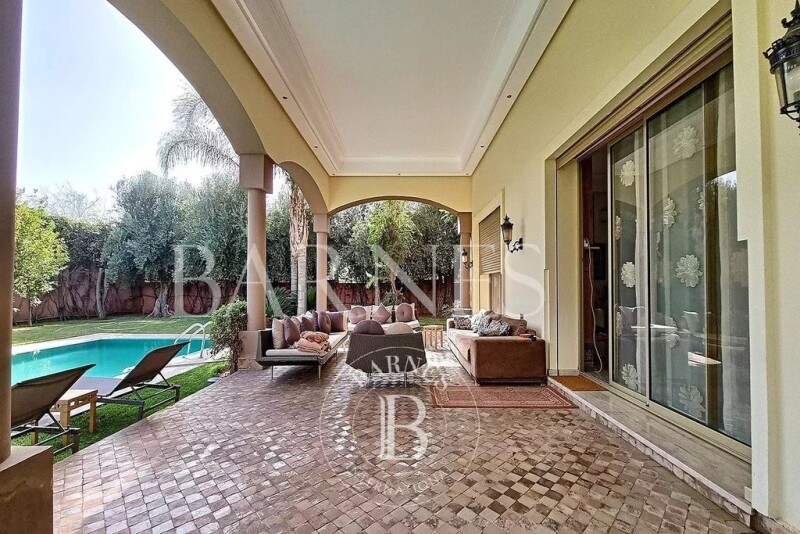 Magnificent property for sale on 1700 sqm of land and 700 sqm of living space, near the Atlas Golf (9 holes), on one level. On the ground floor, there is a very large living room with a fireplace overlooking the swimming pool, a large veranda, a dining room, an equipped kitchen, a large garden, parking for at least 5 cars, a guard lodge, a maid's lodge, and an elevator to access the 5 suites with communicating balcony, strategically located for rental purposes.