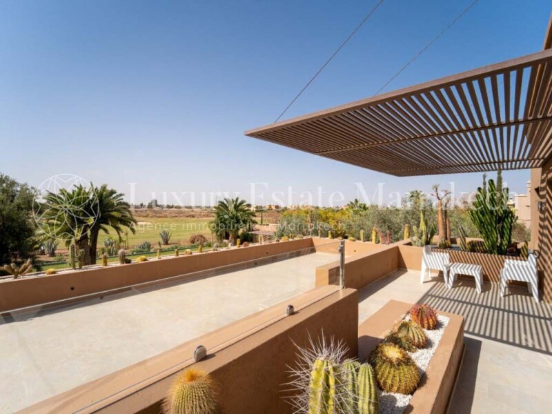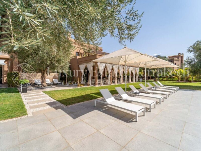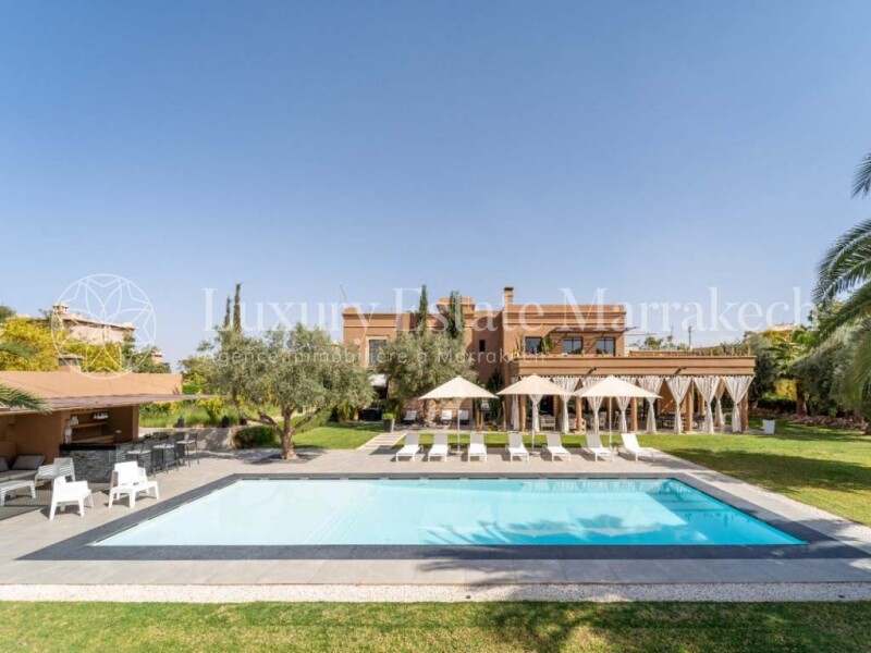 Charming villa of 800 m2, on a park of 2500 m2, spa hammam, domestic accommodation The villa is distributed as follows: 1 main villa with 5 suites and 5 bathrooms, 1 guest toilet, 1 patio, 1 large living room, 1 large living room on the ground floor, 1 dining room, 1 office, 1 equipped kitchen, 1 laundry room, 1 garden with swimming pool, 1 outdoor bar, 1 hammam and 1 massage room, 1 staff room outside and another inside. Built area: 800 m2 Land area: 2500 m2. Very nice amenities.