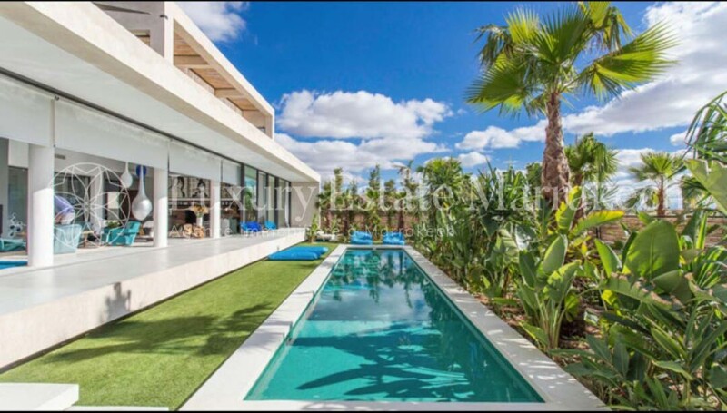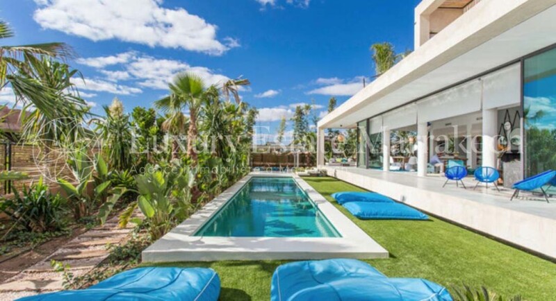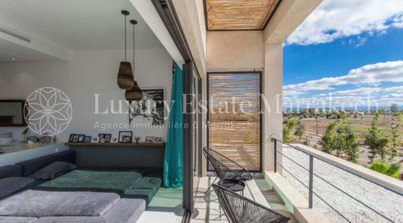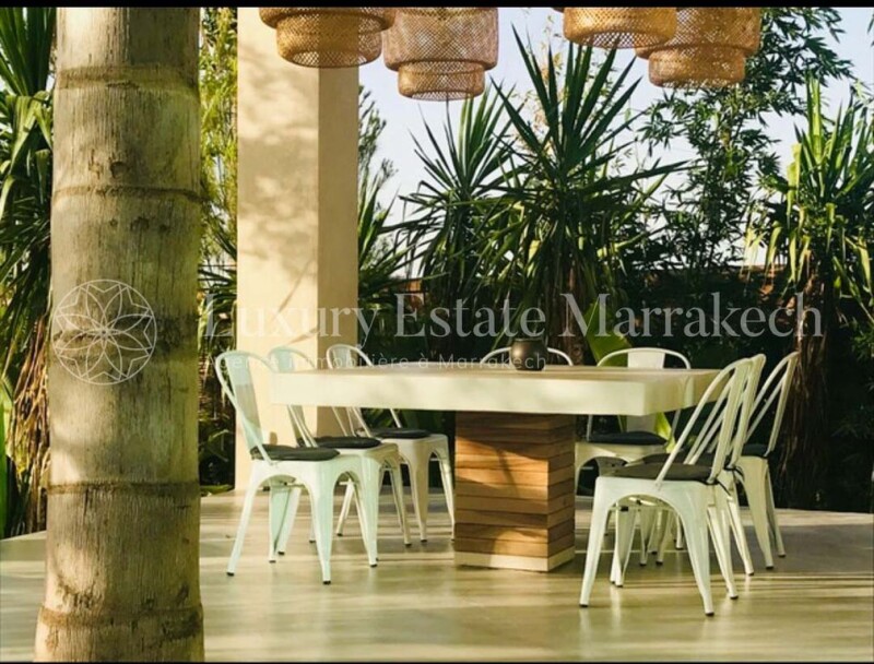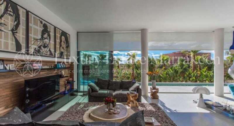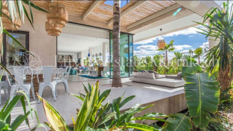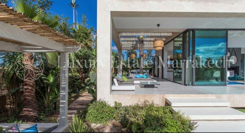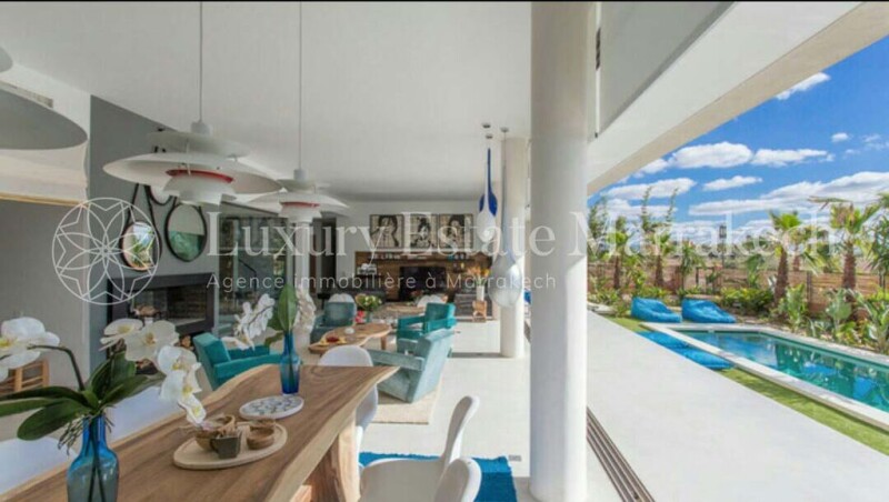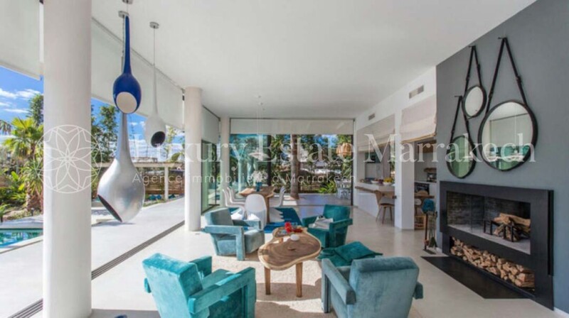 Golf Amelkis, modern villa of 430 m2, 4 bedrooms, 4 bathrooms, on 1400 m2, swimming pool, magnificent Atlas view Superb street art villa open to the outside with a sleek and minimalist design Bay windows and its omnipresent light Kitchen open to the outside Outdoor fireplace 4 comfortable bedrooms all with bathroom. Large interior living room. A house in and out to enjoy winter and summer on a 27-hole golf course Sheathed reversible air conditioning, swimming pool, wifi, such sat. Personal accommodation. A must see.