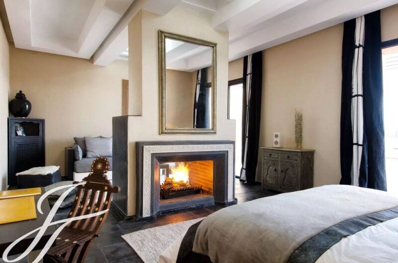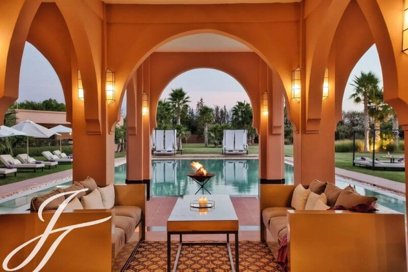 This property is enviably located less than 20 minutes from downtown Marrakech, in a pleasant natural environment. Set on a landscaped 1.7 hectare park with mature trees, the grounds include the main villa, a pavilion, a substantial heated 25m swimming-pool with 2 jacuzzis each for 8 persons, a petanque field, a putting-green and a caretaker's house. The villa features large reception areas such as a living-room with fireplace, a dining-room, a bar, a library, a snooker as well as a shaded terrace. It also comes with a professional kitchen, a spa (hammam and room for treatments), a home cinema and a fitness room. The 10 spacious well apoointed suites all comprise a dressing, a fireplace and private terracing. Additionally, the roof-terrace boasts awesome views over the Atlas mountains. This titled property which is being sold furnished can perfectly be an upscale private residence or a rental venue for events.