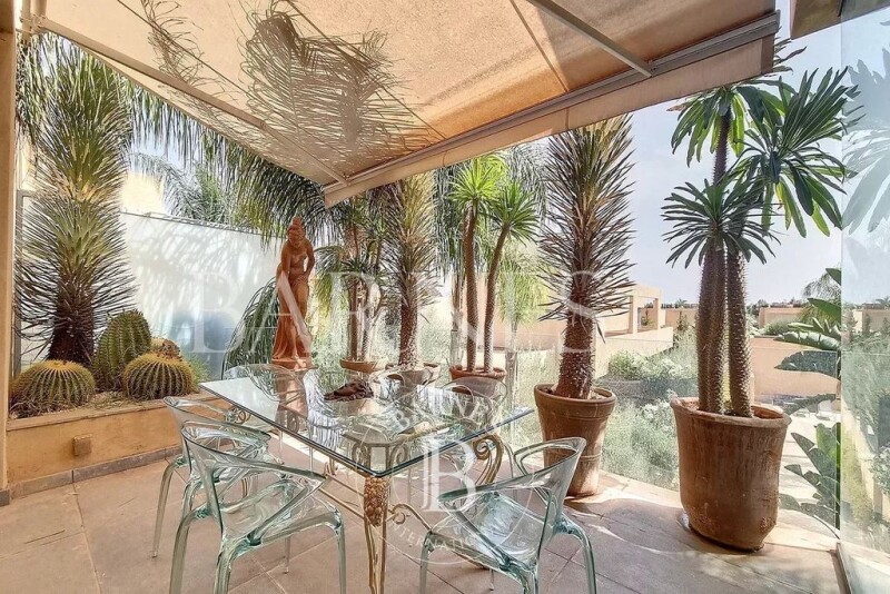 We offer you a stylish apartment located in a residence 20 minutes from the city center. The 133m2 apartment features two bedrooms with two bathrooms, a fully equipped and closed kitchen, and a spacious living room with a beautiful terrace offering a view of the Atlas Mountains. The apartment is sold furnished and comes with a large garage of 35m2 that can accommodate 2 vehicles. The residence features a large swimming pool, an on-site restaurant, and is well-landscaped and secured 24/7.